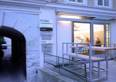 Das Schiebeportal aus entspiegelten Glas ist losgelöst von der historischen Fassade und öffnet den Blick hinein zu Bar, Küche und Koch, sowie hinaus zu Gastgarten und Promenadenpark. Gekocht wird für alle Sinne zugänglich am Bartresen zum Gastbereich. Die Spüle liegt verborgen hinter einem goldbraun schimmernden Metallparavent.